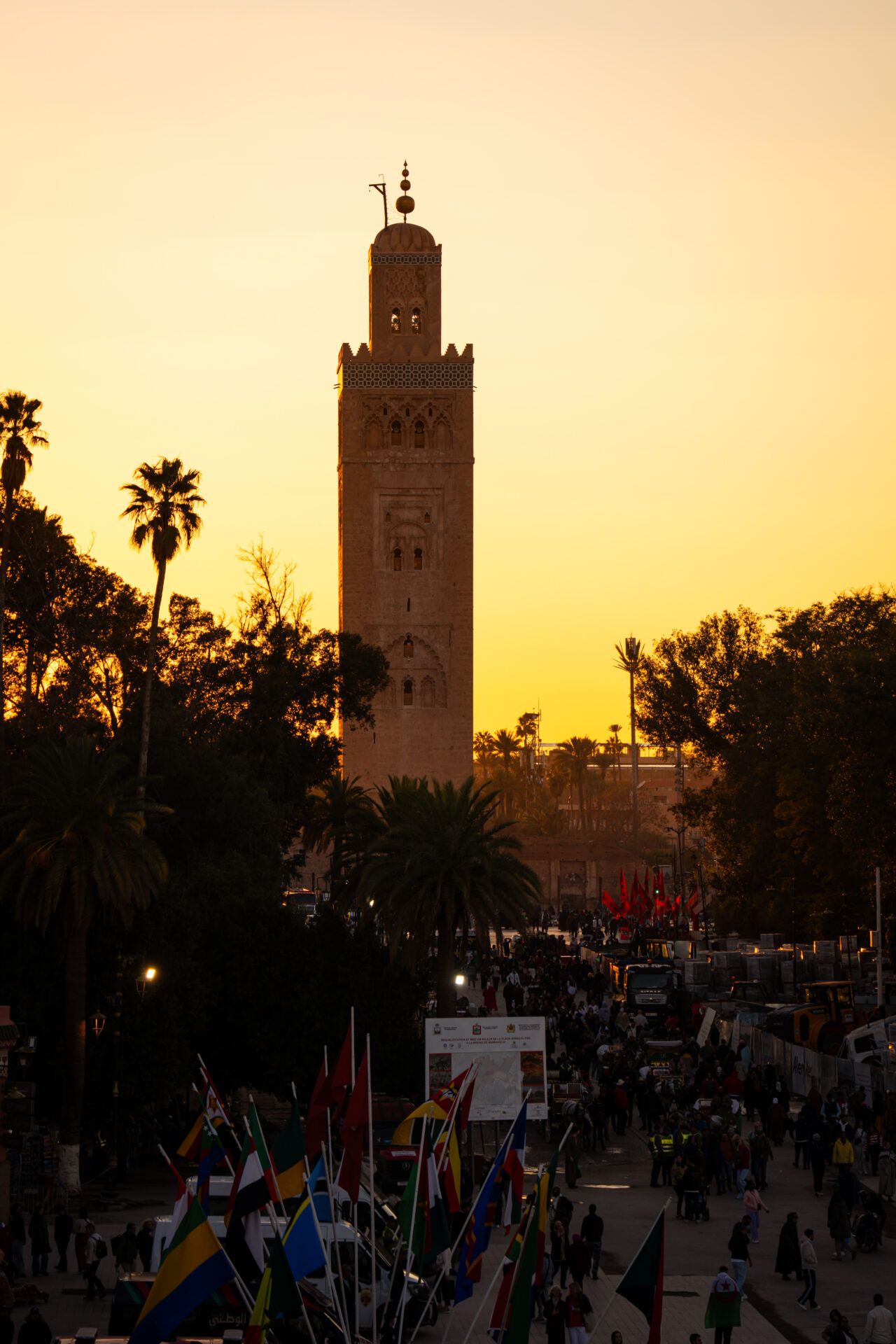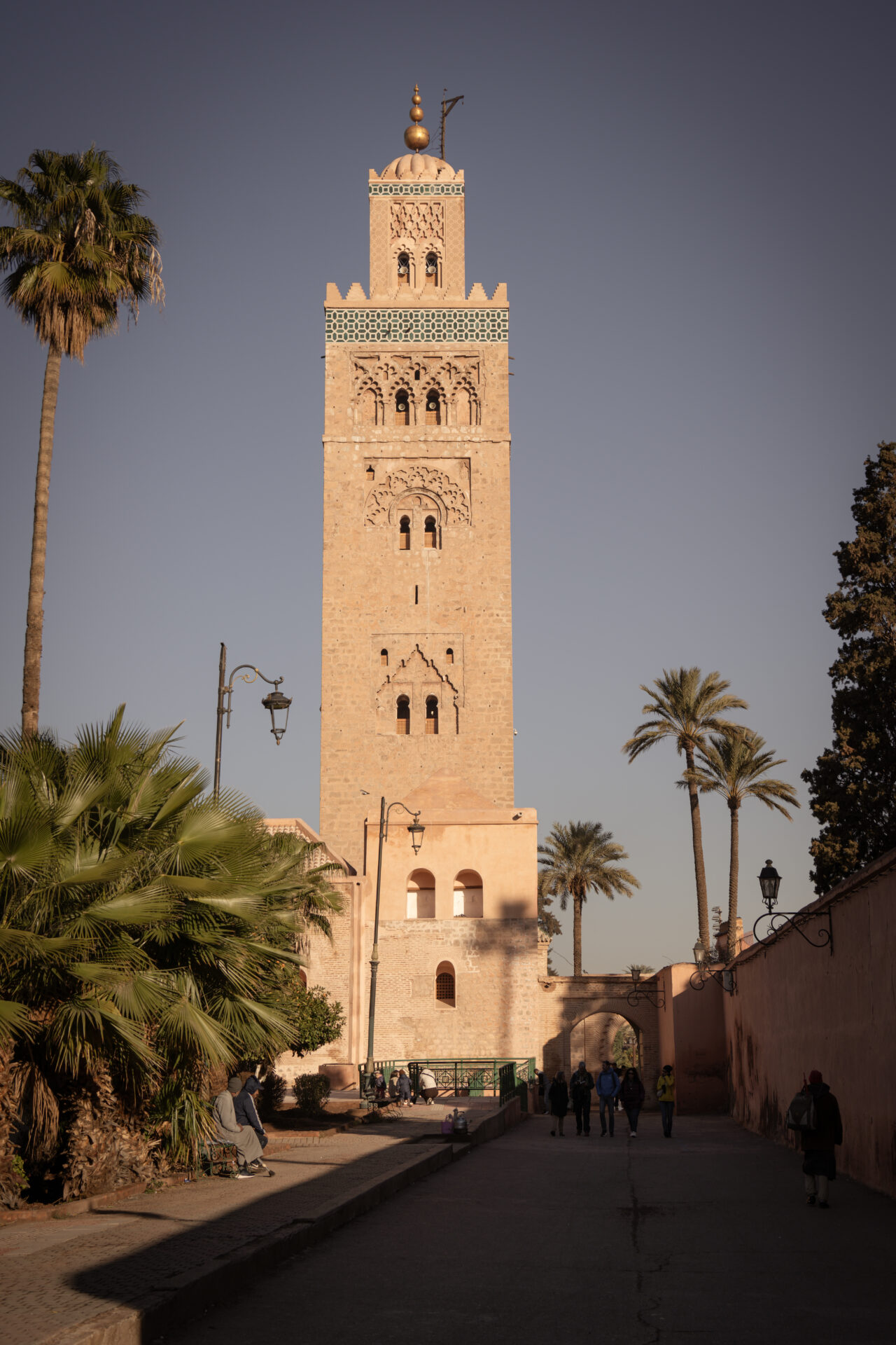 Notre journée commence par un bon petit déjeuner, sur le toit-terrasse de notre riad El Youssoufi. Thé, bananes, cake, fines galettes marocaines… il y a pas mal de choses à goûter sur la table. Vers 9 h, nous débutons notre journée et traversons le souk en direction de la place Jamaâ El-Fna, sans aucun doute la plus connue de la ville. La cité semble encore se réveiller : la plupart des magasins sont fermés, il n’y a pratiquement aucun touriste et seuls quelques livreurs s’agitent dans les rues. La place en elle-même est également bien vide. Nous remontons ensuite l’avenue Jamaâ El-Fna et admirons le minaret de la mosquée Koutoubia. C’est l’édifice religieux le plus connu de la ville, qu’il domine du haut de ses 77 mètres. Construit dès le XIIᵉ siècle, l’accès à la mosquée est interdit aux non-musulmans, mais les jardins sont ouverts au public.