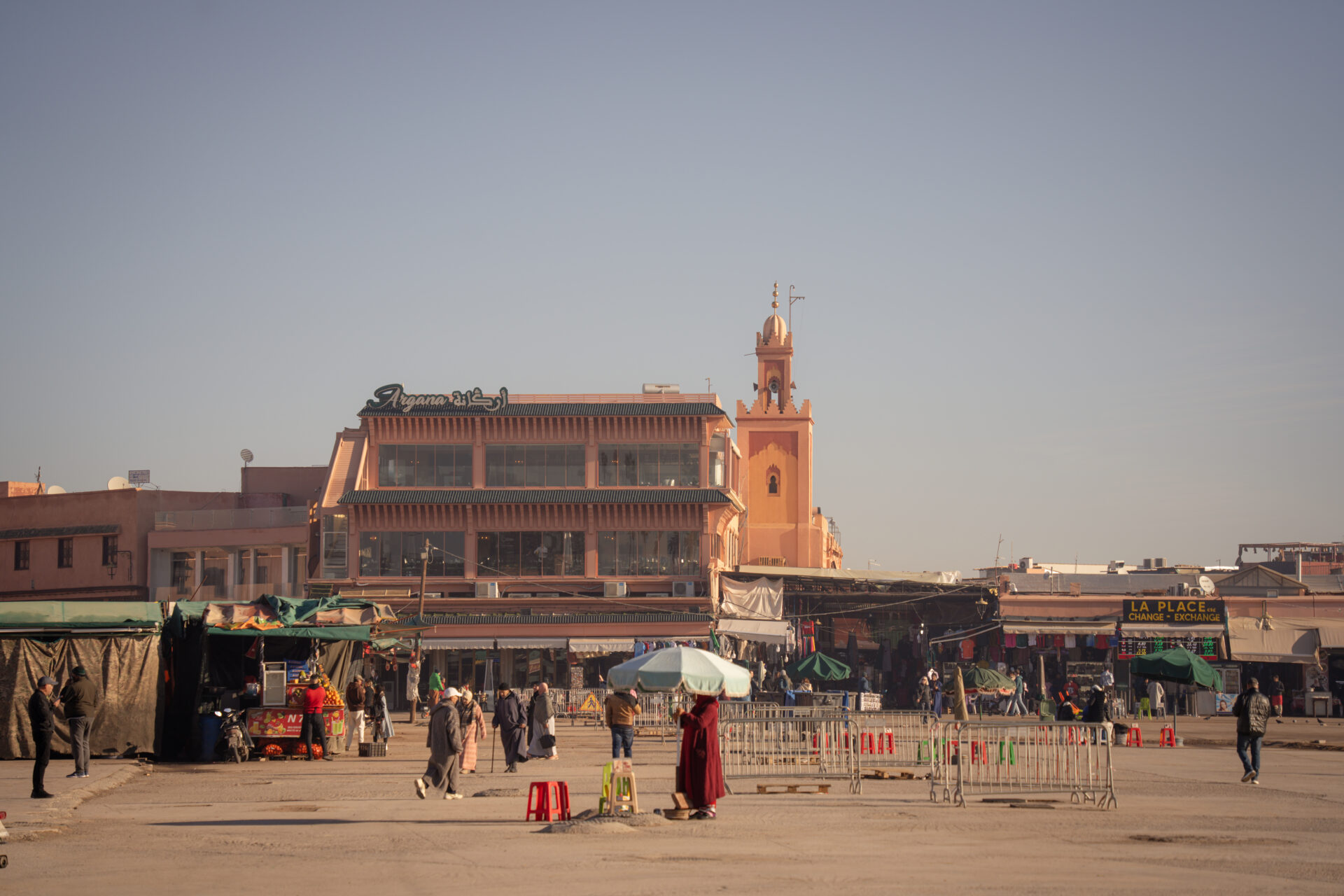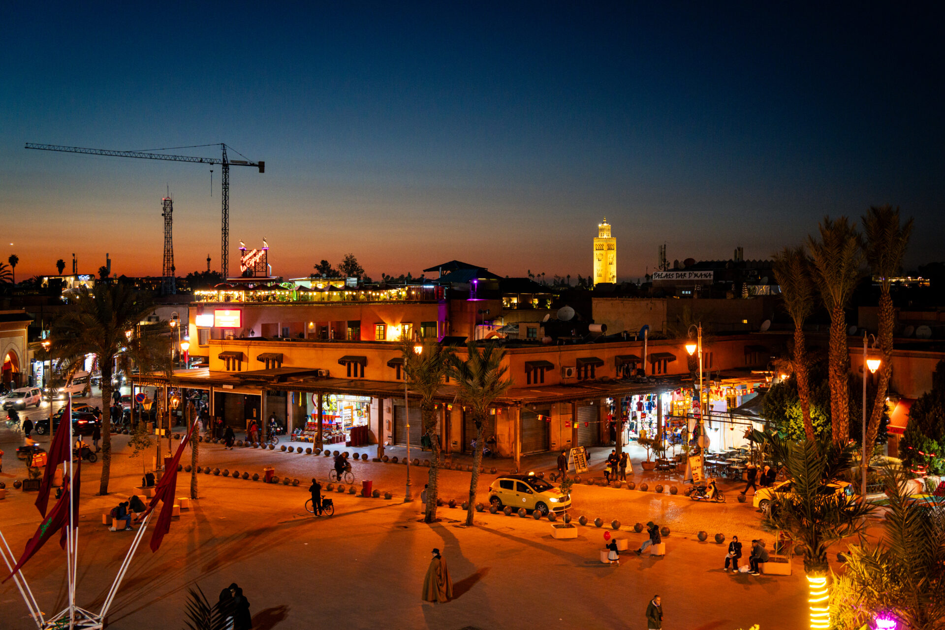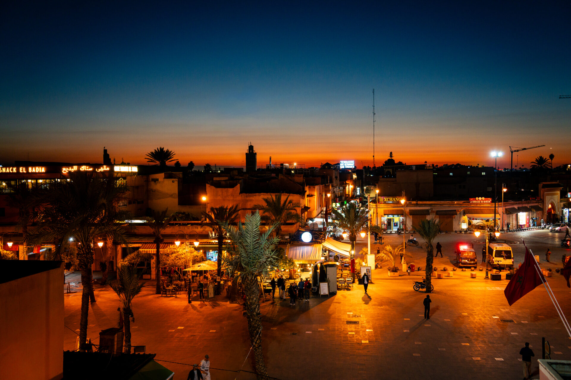 Je grimpe ensuite sur la terrasse du Grand Balcon du Café Glacier. C’est sans doute l’une des meilleures vues sur la place Jamaâ El-Fna et sur la mosquée Koutoubia. Avec le coucher de soleil, la lumière devient plus douce, les couleurs changent et le spectacle est vraiment très joli.