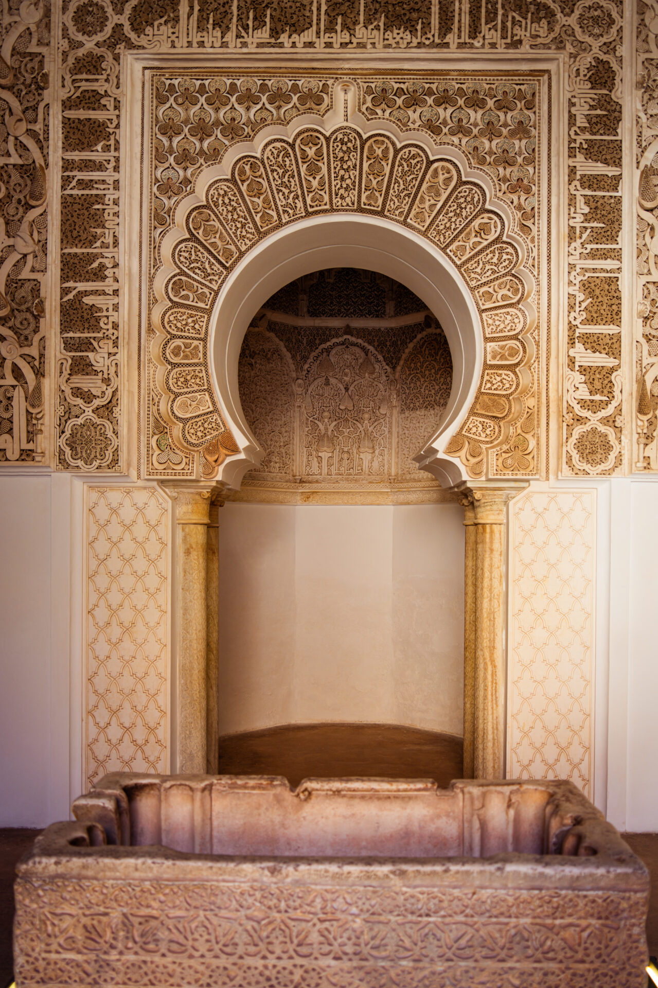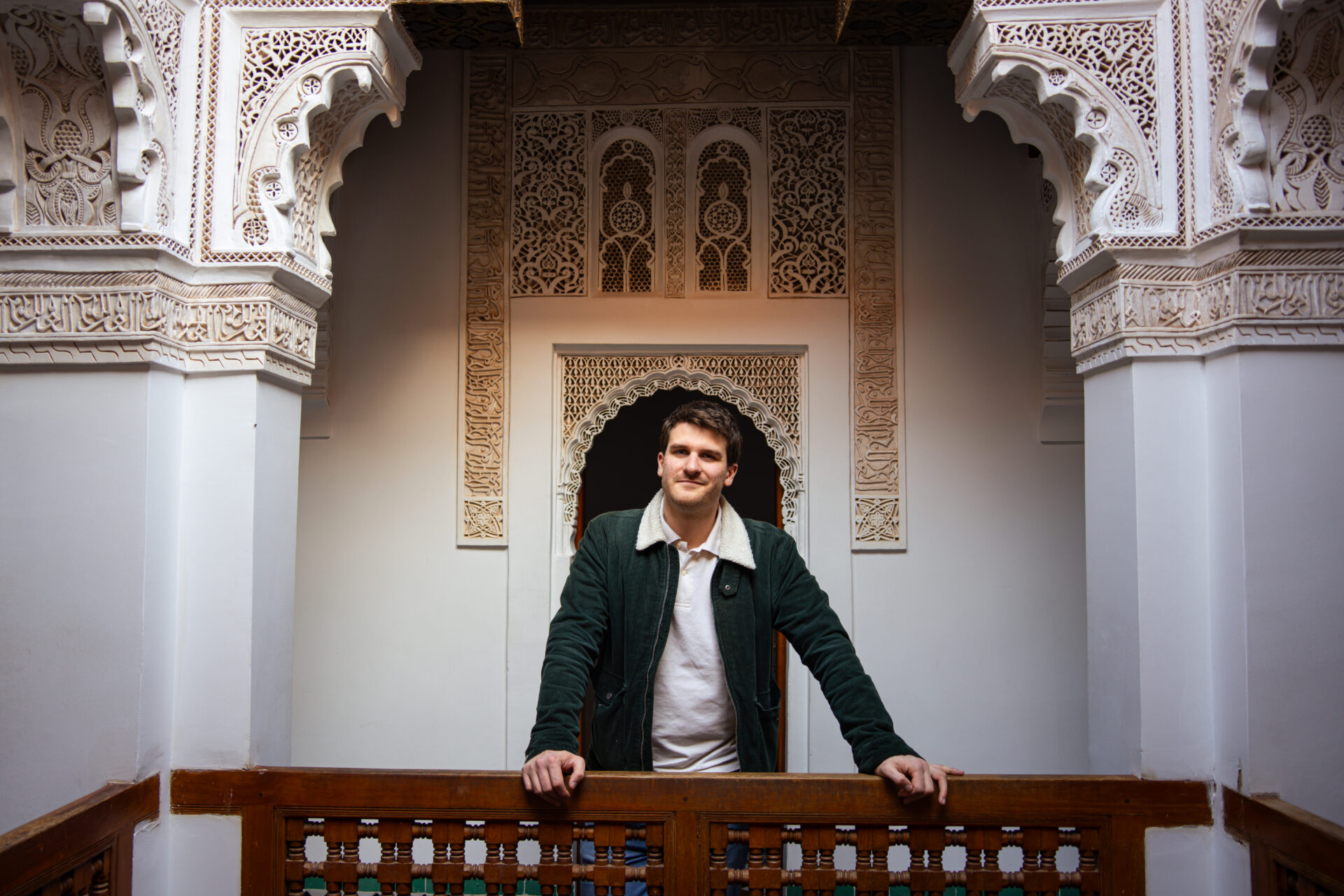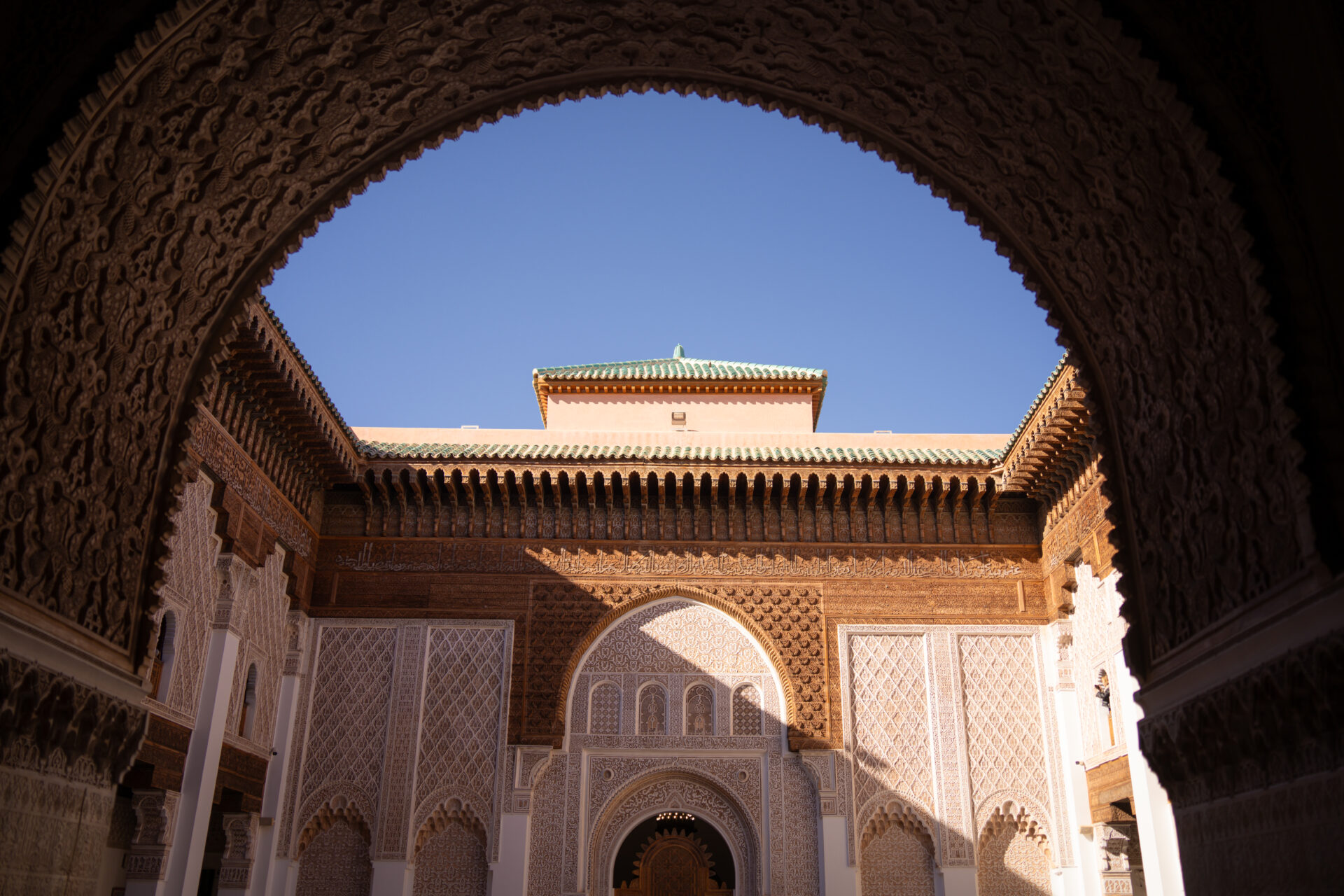 Nous déjeunons chez Tiznit (soupe de lentilles, tajine de Kefta) : pas cher mais pas très bon. Pour le dessert, nous passons littéralement dans l’immeuble d’à côté, au Café Guerrab, où nous prenons un thé et des pâtisseries orientales (plutôt bonnes mais très chères). Nous reprenons notre balade, visitons la medersa Ben Youssef, fondée au XIVᵉ siècle et reconstruite au XVIᵉ siècle par les Saadiens. Elle était l’une des plus grandes écoles coraniques du Maroc et accueillait des centaines d’étudiants venus étudier les sciences religieuses autour d’un vaste patio central. Le bâtiment est remarquable par la finesse de ses décors et sa centaine de minuscules chambres.