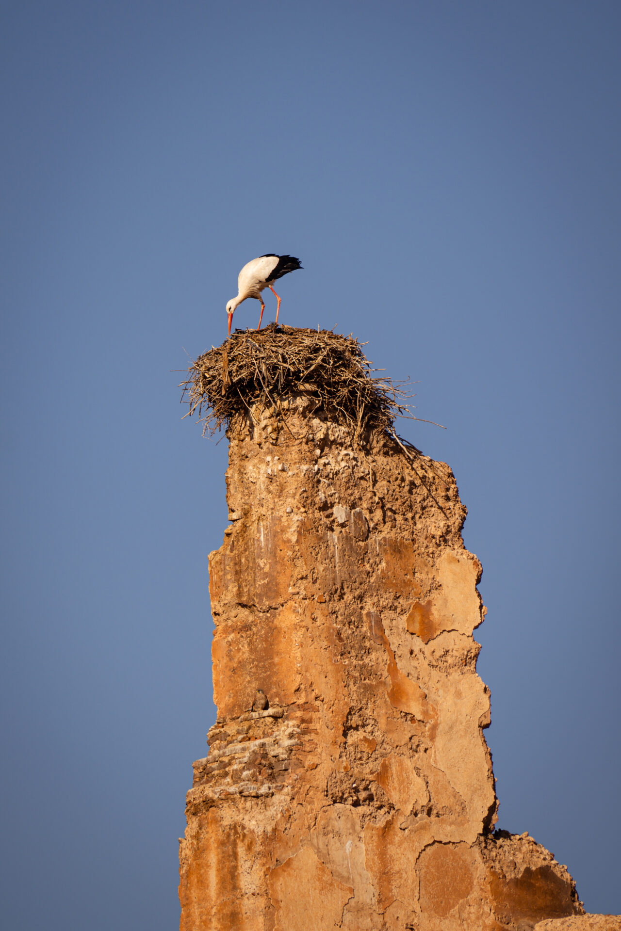 Nous marchons jusqu’au palais El Badiî, construit à la fin du XVIᵉ siècle par le sultan saadien Ahmed al-Mansur. C’était l’un des palais les plus somptueux du Maroc, symbole de puissance et de richesse. Décoré à l’origine de marbre, d’or et de zelliges, il comptait des centaines de pièces organisées autour d’une immense cour centrale. Dépouillé de ses matériaux au XVIIᵉ siècle pour embellir la ville de Meknès, plus au nord, il ne subsiste aujourd’hui que des ruines monumentales. De nombreuses cigognes nichent sur les murs ou à proximité.