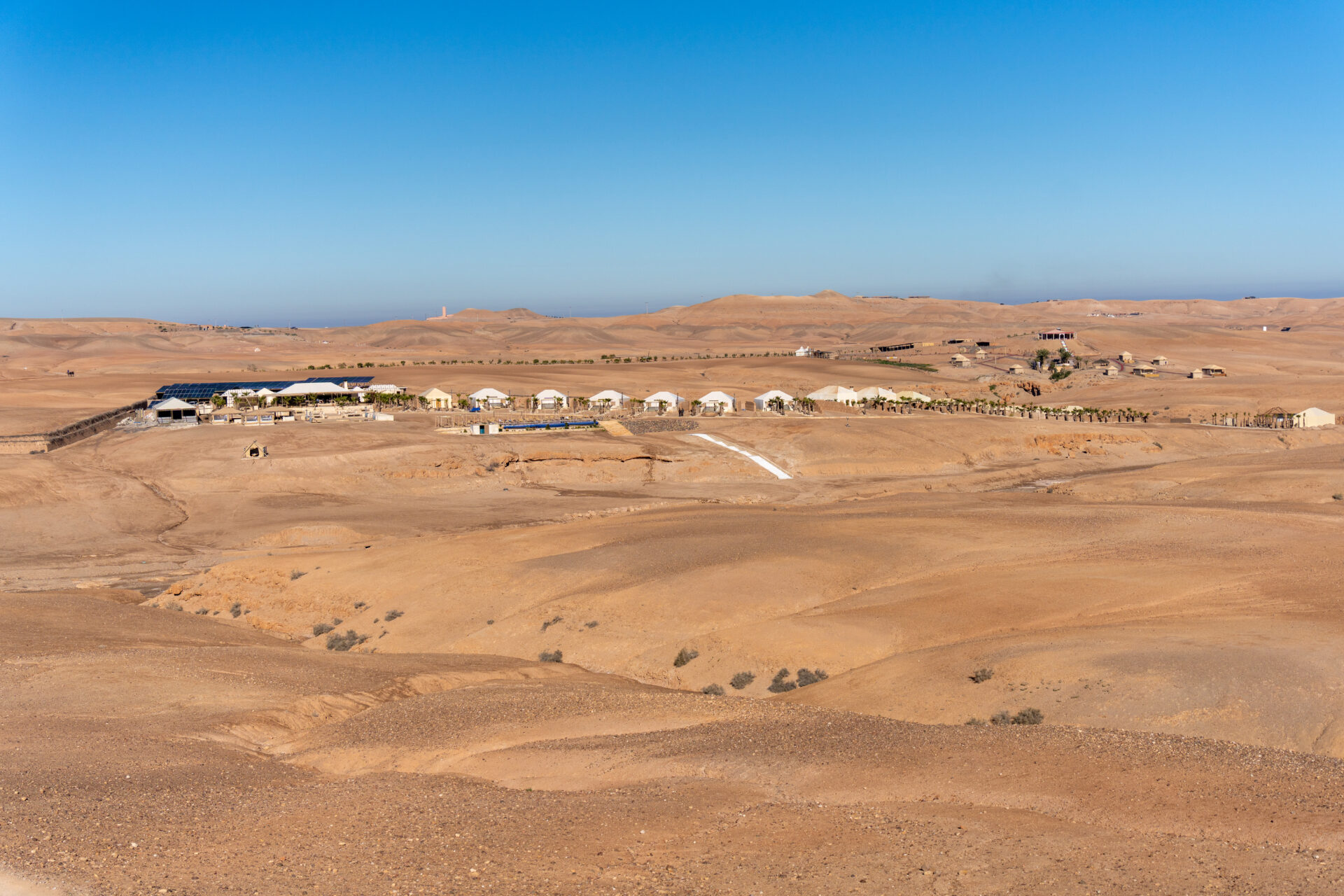Après le petit-déjeuner, nous partons visiter le jardin Secret, un jardin historique situé dans la médina de Marrakech, dont les origines remontent au XIXᵉ siècle. Récemment restauré, il se compose de deux espaces distincts : l’un de style islamique traditionnel, l’autre inspiré des jardins exotiques, avec fontaines, bassins et plantes variées. Le site souffre clairement de la comparaison avec le jardin Majorelle visité quelques heures plus tôt, mais nous nous asseyons et profitons du soleil, si rare à Paris à cette saison (il y avait de la neige chez nous la veille de notre départ à Marrakech !). Après une nouvelle petite balade dans le souk, nous sautons dans une voiture pour une heure de route jusqu’au désert d’Agafay.