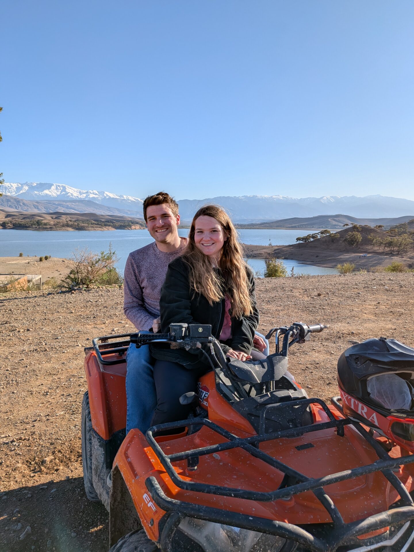 À peine arrivés, nous partons pour une longue promenade en quad de deux heures avec un jeune guide adorable et très investi, notamment dans la prise de photos et de vidéos ! Au programme : un arrêt près d’un barrage et une petite pause thé chez les Berbères en plein milieu du désert.