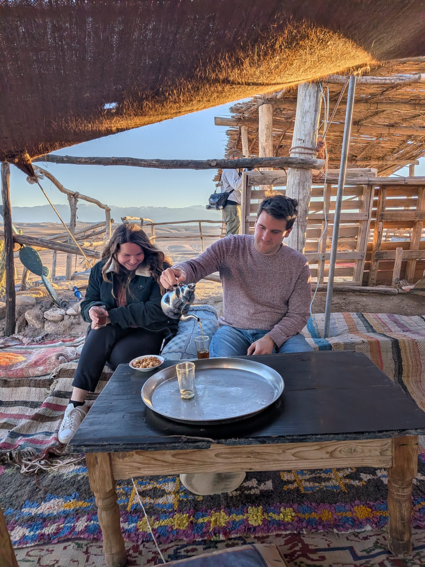 Nous nous réveillons avec les premières lueurs du jour. Nous sortons admirer le lever du soleil et prendre quelques photos… mais il fait terriblement froid, nous sommes frigorifiés ! 🧊 Pour nous réchauffer, nous passons au petit-déjeuner. Ce matin, Anaïs a décidé de s’offrir un nouveau massage. Je quitte donc notre tente et part me balader dans le désert.